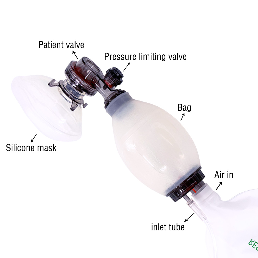O ressuscitador manual é feito principalmente de silicone de grau médico, que apresenta excelente flexibilidade, elasticidade e biocompatibilidade. É macio ao toque e se ajusta perfeitamente ao rosto, ajudando a reduzir lesões por pressão na face do paciente.
