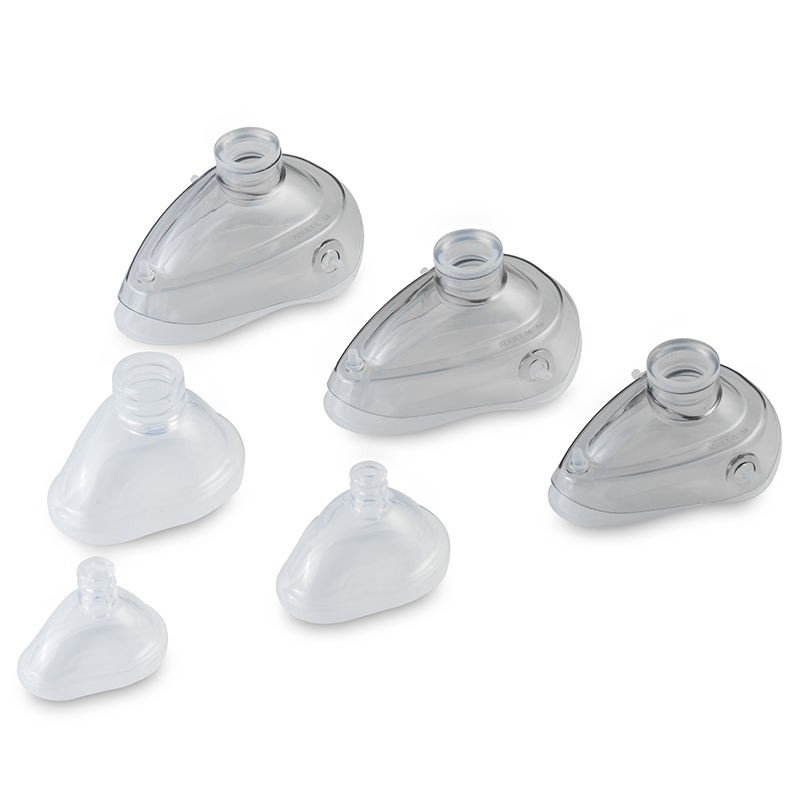 Medical reusable silicone anesthesia mask features an open cuff design, available in six sizes for general anesthesia, and is compatible with automatic ventilators and manual resuscitators. This reusable mask can be repeatedly autoclaved at 121°C, with a transparent PC shell for easy monitoring of bleeding, vomitus and spontaneous breathing. It is equipped with a soft silicone cushion for optimal facial fitting and built-in buttons for quick assembly after serialization. The mask is non-sterile, latex-free, and made with medical-grade silicone and PC materials for exceptional comfort during use.